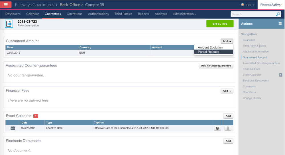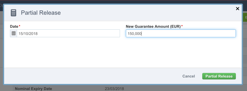 The first part of the feature, a specific action for partial release, is available right now. All roles who were allowed to manage the guaranteed amount now have the right to manage partial release meaning that all users with such roles will see the new action as depicted below. Of course the form will check that it is really a partial release by preventing the input of an amount greater than the one at the modification date.