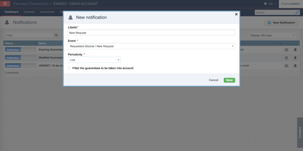 Our new Notification Module is here and we hope that you will the flexibility it brings to you daily use of Fairways Guarantees. It aims to simplify the use of Fairways Guarantees by letting the system push you the information you need instead of connecting to it and navigating to the right page to see if anything happened recently. It builds on the notification mechanism we had previously but adds mainly two things (along with a full technical overhaul): flexibility and real-time notification when pertinent.