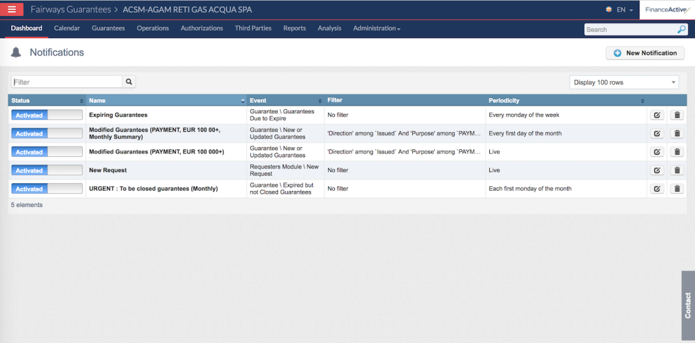 And you can have multiple notifications for the same event just by modifying the periodicity and/or the applied filter. As an example we do the same notification as before (any creation/modification of payment guarantees whose amount is greater than EUR 100,000.00) but want a monthly mail summary the first day of each month.