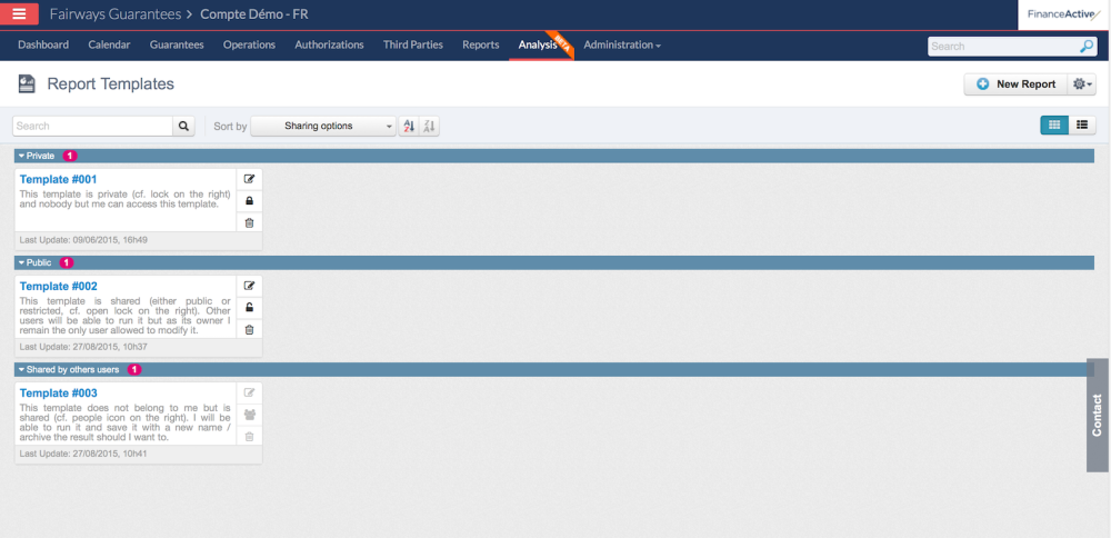 By popular demand, and to speed up standard reporting across a company, we added template sharing in the new Analysis Module. This feature allows you to define public templates that will then be available to all your colleagues. Sharing a template is a good way to save time on template creation (the report is designed once for everybody) and to ensure that reporting, in its construction, is coherent across your organisation.