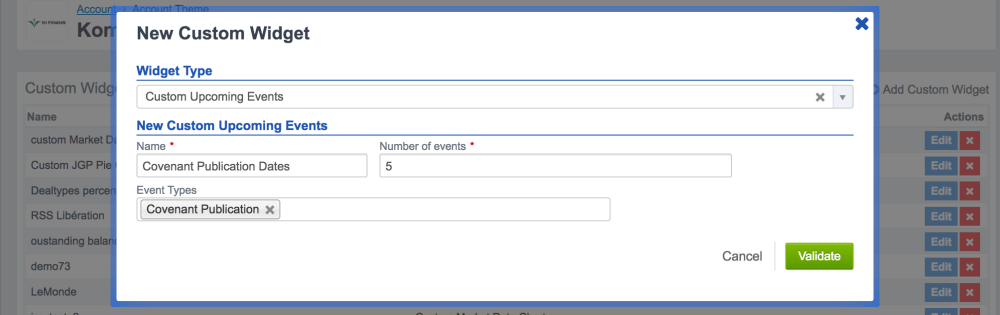 In order to improve the configuration of your dashboard, a new widget is available. this widget allows you to display a specific Event Type, such as a Collateral Revision Date or a Covenant Publication date.