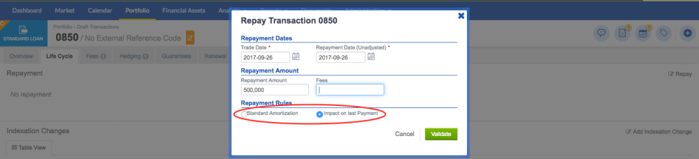 - Or choose the ‘Impact on last Payment’ method. The system will not impact the followings payment (same amounts as before the partial repayment). However, the last payment is reduced by the principal repayment amount.