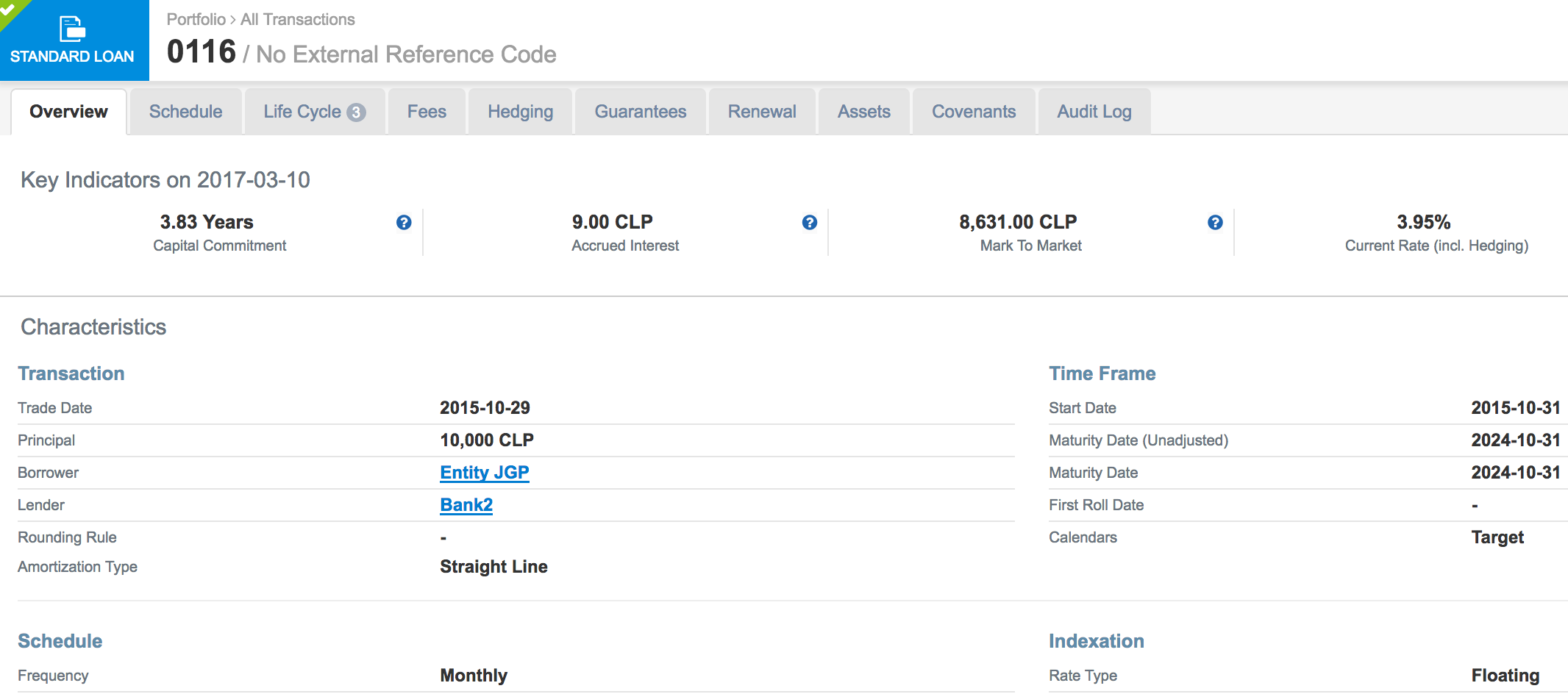 Users can now browse through different tabs in order to find the information they’re looking for. Overview, schedule, transaction life cycle, fees, hedging, guarantees, renewal, assets, covenants, audit log: every piece of information is in the right place to be easily found when you most need it.